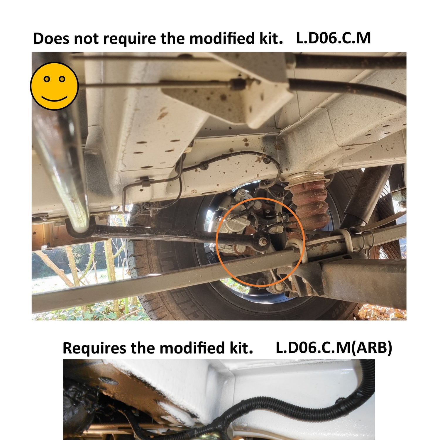 If your vehicle has the new anti roll bar as shown in the bottom photo below then this is the correct kit for you L.D06.C.M ARB, if it does not have the new anti roll bar and has one like in the top photo or may has no anti roll bar then you need kit ref L.D06.C.M, if you are unsure please email us some photos to mail@marcleleisure.co.uk so we can advise you which kit to select.